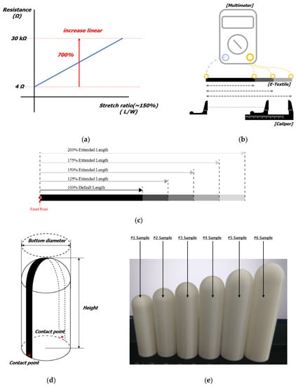The E-textile sensor measures the resistance change according to stretch rate: (a) Graph of resistance change according to elongation rate; (b) Measurement of resistance according to stretch rate; (c) Change in length from 100% to 200% at a fixed point; (d) Mock-up sample sensor measurement schematic diagram; (e) Mock-up samples produced according to size.