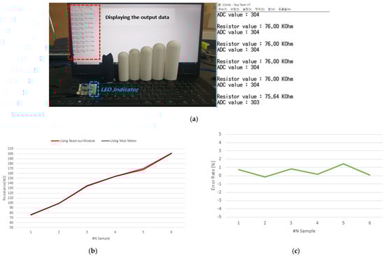 The sensor board outputs the analog to digital converter (ADC) value and the resistance value of the sensor through serial communication with the PC and analyzes the difference between the resistance value output of the sensor board and the resistance value measured by the Multi-Meter. The picture on the right shows the actual resistance value of the fiber sensor in the Multi-Meter. direct current (DC) and output resistance values are serials of the read-out module of the fabricated fiber sensor. The output data was recorded and the difference in the measured value–output value was expressed as a percentage (%), as shown in Figure 7.