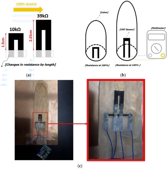Changes in resistance according to changes in length: (a) Measurement of resistance change at 150% length change; (b) Measurement of resistance according to length of the CNT sensor; (c) CNT sensor-based measurement prototype configuration.