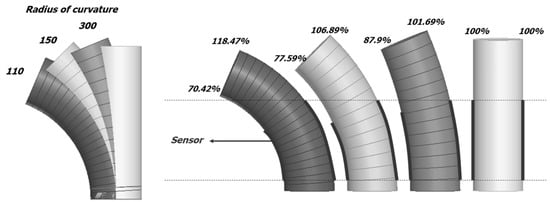 As shown in Figure 9, the changes in elongation and resistance were measured at a radius of curvature of 110, 150, and 300. A sensor was placed at each side of the sample and was measured, as shown in Figure 7. The inside length in the bending direction was shortened and maintained the initial resistance, while the outside length tended to increase, as shown in Table 3.