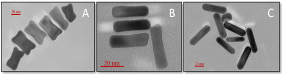TEM images of synthetized GNBs (A and B) and commercial GNRs (sample C).