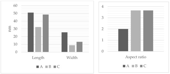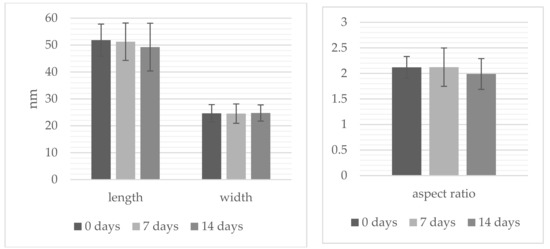 TEM results (Figure 5) were consistent with the changes observed in the absorbance spectra, morphological alterations being evident after 14 days, with an obvious smoothing of the edges. The latter phenomenon may be considered as the natural time evolution of nanostructures towards more stable geometries (Figure 6), doubled by the effect of residual reagents from the fabrication process [33]. These unreacted reducing agents alter the morphology, especially at the edges of the rods, where the stabilizing double layer of CTAB is less densely packed compared to other regions [34].