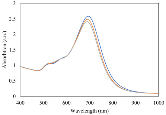 Absorbance spectra of GNBs right after synthesis (blue), and after 7 (orange), and 14 (grey) days of storage at room temperature.