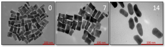 TEM images of GNBs—after synthesis (0), 7, and 14 days of storage at room temperature.