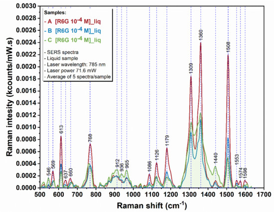 SERS spectra of R6G in colloidal dispersion of GNBs (samples A and B) and GNRs (sample C).
