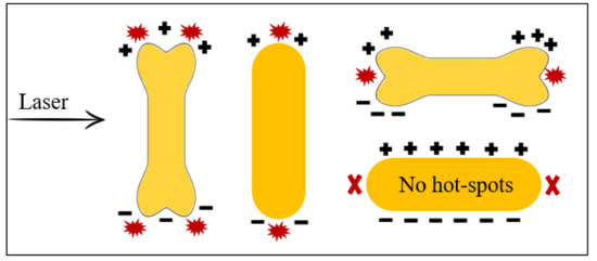 This observation might be explained by the interplay of several factors. The main cause of Raman signal augmentation is the high curvature of the GNR’s ends (lightning rod effect). This implies that, for a maximum enhancement of the electromagnetic field surrounding the particle (Figure 8), the excitation laser’s direction must be perpendicular to the long axis of the GNRs. In dispersion, due to the random orientation of the GNRs, the enhancement of the signal is relatively low. In contrast to GNRs, GNBs amplify the signal regardless of laser’s orientation [13]. When the laser is parallel to the long axis of the GNBs, hot-spots are formed between the lobes at the ends with the same favorable effect on the recorded SERS signal. The sharper edges of GNBs in comparison with GNRs might be another factor responsible for the superior SERS activity of GNBs in dispersion [36]. Finally, the size of the nanostructures has also a substantial influence on signal enhancement, as it was demonstrated that smaller nanorods generate stronger local electromagnetic fields [37] and thus, higher SERS signals, due to a stronger lightning rod effect and a weaker radiation damping.