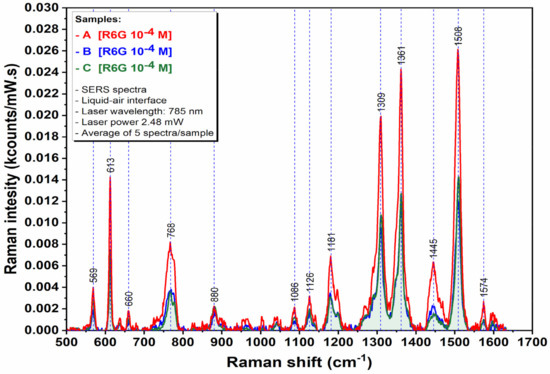 Studies at the liquid interface showed that the Raman signal can be further enhanced by the aggregation of nanostructures in films. By recording the SERS signal of R6G 0.1 mM at the liquid-air interfacial region, a 17, 18, and 55-fold increase (Table S1) of Raman intensity is observed for samples A, B, and C, respectively (Figure 9) as compared to the colloidal systems.