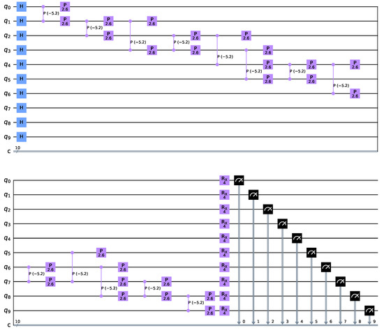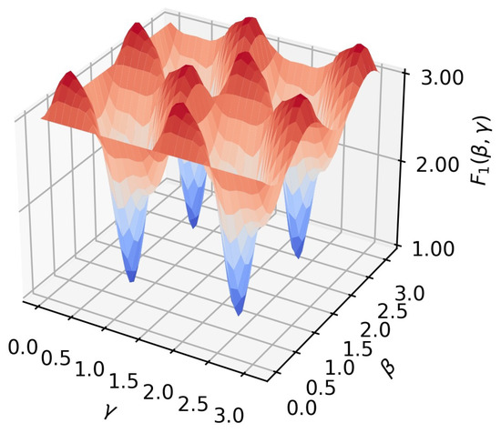 In our case n = 10, there are two A–class edges and eleven B–class edges. This yields Equation (9), which is depicted in Figure 3 which shows the periodicity in both parameters and exhibits a highly nonlinear behaviour.Farhi et al. [20] proposed QAOA with the structure represented in Figure 4.