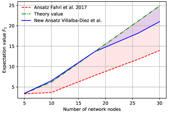 The results confirm our expectations and our proposed QAOA algorithm predicts the analytical results better for a shallow quantum circuit with . A summary of the results for different numbers of nodes is shown in Figure 6. In Table 1 we represent the comparison of the analytical solution curve and the respective QAOA algorithms. Our solution shows better performance in all metrics.