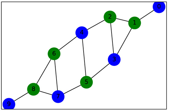 The bit string that delivers the optimal solution is , as shown in Figure 7. This graph clearly shows the configuration obtained by the QAOA algorithm presented with two types of nodes represented in two colors, green and blue .