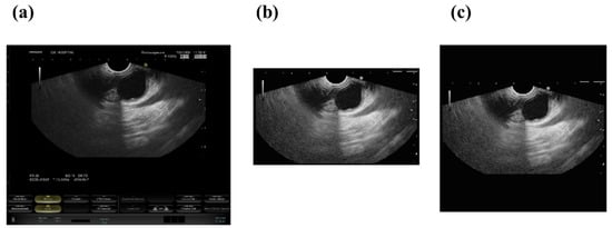 Image processing and zero-padding of the endoscopic ultrasonography images. (a) Original image, (b) Histogram equalized and cropped image, and (c) padded image.
