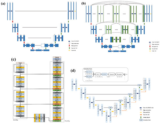 Architecture of each model, (a) Basic U-Net, (b) U-Net++, (c) Residual U-Net, and (d) Attention U-Net.