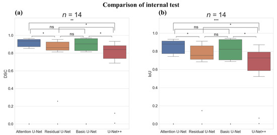 Comparison of the internal test with Boxplot representation and Wilcoxon test results between the deep-learning algorithms. (a) Boxplot representation and Wilcoxon test results of dice similarity score (DSC) and (b) Boxplot representation, and Wilcoxon test results of intersection over union score (IoU). ns: not significant, *: p-value < 0.05, **: p-value < 0.01, ***: p-value < 0.001, Number of images (n) = 14.