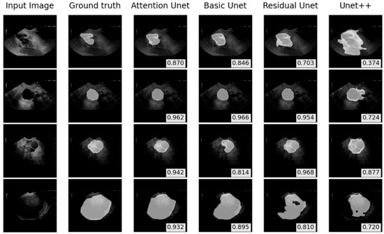 The pixel accuracy and specificity of all models showed a high score (>0.960). This can be explained by the fact that the EUS images contain large areas of negative pixels that are not related to the PCLs. Although the Residual U-Net yielded the highest pixel sensitivity, the DSC and IoU scores of the Residual U-Net were lower than those of the Attention U-Net and Basic U-Net.
