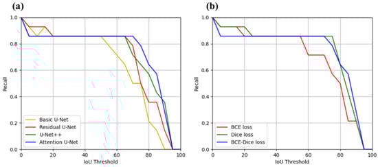 Figure 5a shows the comparison of the deep-learning models on the Recall–IoU curve. The recall score of all models gradually decreased as the IoU threshold increased. However, the Attention U-Net performed better on the four deep-learning models. Figure 5b shows the comparison of the Attention U-Net models trained using the three-loss functions. The model trained by the BCE–Dice loss showed the highest recall score when the IoU score was greater than 0.8.