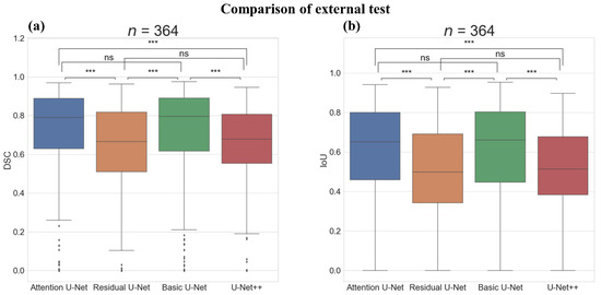 Figure 6 shows the boxplot and Wilcoxon test results of the models on the external test. There was a significant difference in the DSC and IoU score between the Attention U-Net and Residual U-Net (p-value < 0.001) and between the Attention U-Net and U-Net++ (p-value < 0.001). Moreover, there was a significant difference between the Basic U-Net and Residual U-Net (p-value < 0.001) and between the Basic U-Net and U-Net++ (p-value < 0.001); however, there was no significant difference between the Attention U-Net and Basic U-Net. The comparison of segmentation results on the external test is illustrated in Figure 7.