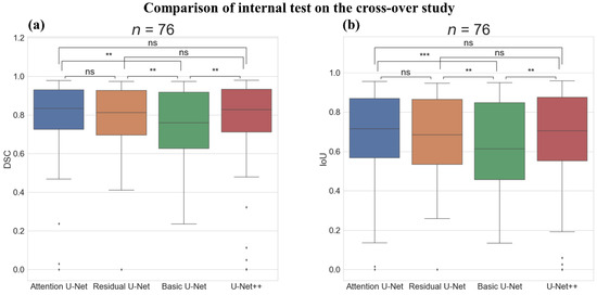 Comparison of the internal test on the cross-over study with Boxplot representation and Wilcoxon test results between the deep-learning algorithms. (a) Boxplot representation and Wilcoxon test results of dice similarity score (DSC) and (b) Boxplot representation, and Wilcoxon test results of intersection over union score (IoU). ns: not significant, **: p-value < 0.01, ***: p-value < 0.001, Number of images (n) = 76.