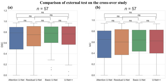 Comparison of the external test on the cross-over study with Boxplot representation and Wilcoxon test results between the deep-learning algorithms. (a) Boxplot representation and Wilcoxon test results of dice similarity score (DSC) and (b) Boxplot representation, and Wilcoxon test results of intersection over union score (IoU). ns: not significant, Number of images (n) = 57.