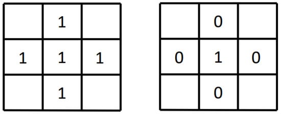 First, the target pixels in the image are divided into external points, internal points, and isolated points. As shown in Figure 1, the left image is a schematic diagram of internal points and the right image is a schematic diagram of isolated points. Consider the center pixel and its four-neighborhood pixels: if the center pixel is the target pixel and its four-neighborhood pixels are also target pixels, it means that the center pixel is an interior point; if the center pixel is the target pixel and its four neighboring pixels are all background pixels, then this center pixel is an isolated point. Pixels that are neither internal points nor isolated points in the target area are boundary points.
