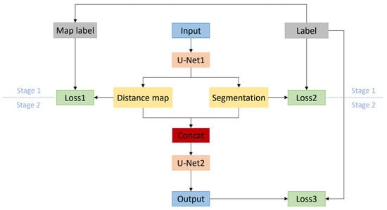 In our method, the expected distance map after distance transformation with the edge of the left atrium as the target area is a grayscale image and also a weight map: the closer the area to the edge of the left atrium, the larger the pixel value is, and vice versa. It is conceivable that using such a weight map to participate in training can make the network pay more attention to the area near the edge of the left atrium. Moreover, the distance map is generated offline, not bringing additional overhead to training. Figure 2 is a schematic diagram of the overall architecture of the method. In the figure, “Label” represents the real label, “Map label” represents the distance map generated based on the real label, “Input” represents the training image, “Distance map” and “Segmentation”, respectively, represent the distance map and the rough segmentation result output by the network in the first stage, and “Output” represents the output of the second stage of the network.