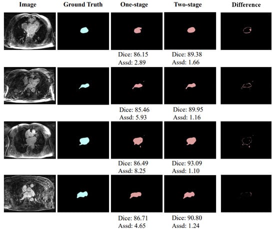 As shown in Table 1, the two-stage achieves and mm improvements over the original 3D U-Net in the Dice score and Assd, respectively, which verifies the effectiveness of the two-stage learning. In addition, Figure 4 shows a schematic diagram of partial segmentation results and the segmentation difference between one-stage and two-stage methods. The units of Dice score and Assd in Figure 4 are % and mm, respectively. It can also be intuitively observed from the figure that the segmentation of the two-stage network is closer to the ground truth.