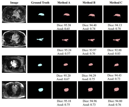 As shown in Table 2, although Method C uses the edge of the left atrium as the distance map, it can also improve network performance, which can prove that the idea of using the distance map module is correct and feasible. However, the information provided by Method C is quite limited and cannot provide continuous information of strong and weak changes like a real distance map, so the performance of this method is not optimal. In addition, the performance of Method B is lower than that of Method A, and even slightly worse than that of Method C. The reason may be that, although the distance map generated by Method B can provide continuous information, the intensity of pixels at the same distance inside and outside the left atrium edge is asymmetrical, which may interfere with the learning of the network. The abovementioned results prove that the distance map generated by Method A can provide the most reasonable auxiliary information to help network learning. Figure 5 shows a schematic diagram of partial segmentation results. The units of Dice score and Assd in Figure 5 are % and mm, respectively.