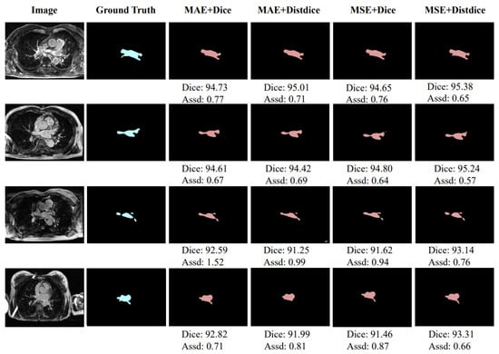 Table 3 shows the results of comparative experiments on using different loss function combinations to optimize training. The loss function used by the image decoder in the first stage is always Dice Loss. In Table 3, MAE Loss and MSE Loss represent the optional loss function used by the distance decoder in the first stage, and Dice Loss and Distdice Loss only represent the optional loss function for the second stage of network training. As shown in Table 3, when the distance decoder branch uses MSE Loss and the second-stage training of the network uses Distdice Loss, the highest segmentation level can be achieved, with an average Dice score of and an average Assd of mm. Figure 6 shows the segmentation of training using different combinations of loss functions. The units of Dice score and Assd in Figure 5 are % and mm, respectively.