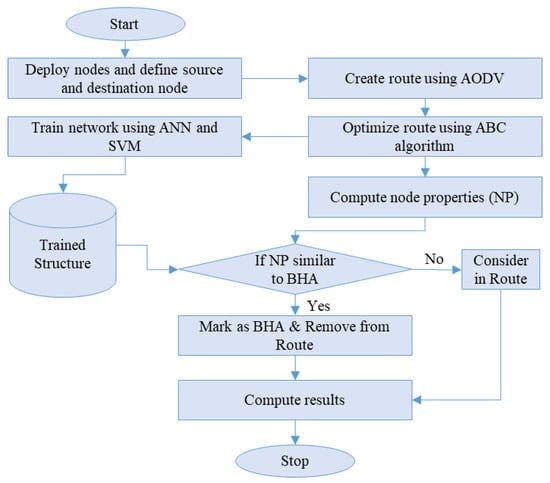In this research, an enhanced routing protocol (i.e., AODV) is proposed and utilized in the detection of BHA nodes. The entire flow is provided in Figure 2. The proposed work is mainly partitioned among three sub-parts.