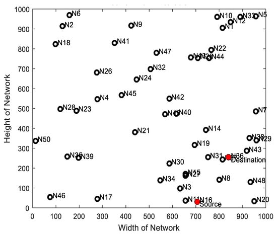Initially, N number of nodes are deployed within a defined length and width of (1000 × 1000). Each node is labeled by (N1, N2, …, Nn), including the source (N16) and the destination node (N36) where n is the number of deployed nodes.