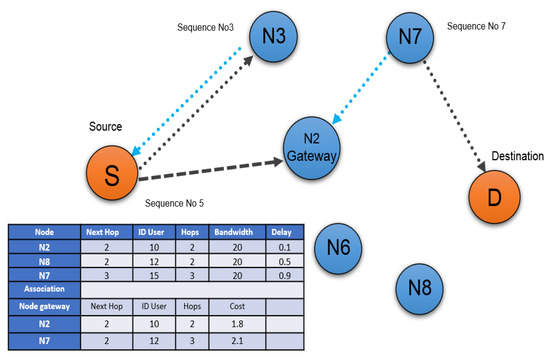 The enhanced value of this number determines the most suitable path. As presented in Figure 3, the source node (S) broadcasts RREQ messages, which are received by nearby nodes denoted by N2, N6, and N3, respectively.