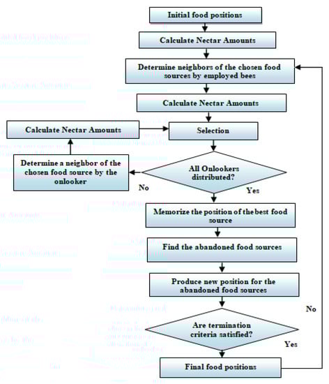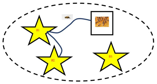 ABC is mainly composed of three kinds of bees: onlooker, forger, and scout bees. The onlooker bee’s role is to select a food source by just watching the waggle dance of the other bees. The role of forger bees is to constantly visit the food source to obtain nectar. Scout bees are those who conduct random searches to discover new sources of food [33]. The pictorial representation of the bees’ searching process of food is illustrated in Figure 7.