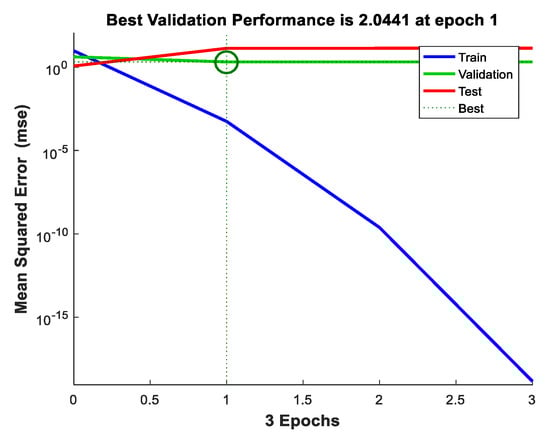 The MSE concerning epochs generated by the ANN algorithm is shown in Figure 10. The graph mainly consists of four different values as represented by different colors such as blue, green, red, and dotted lines, which represents the error values of the train, validation, test, and best-obtained solution, respectively. Here, the best-trained structure is obtained at the first epoch that carries an MSE of 2.0441. This is because RBF helps to reject the outermost properties of the nodes from the properties set and then SVM selects only support vectors as properties with minimum MSE [36]. The authors only run up to three epochs because the ANN targets are to fulfill the requirements in three epochs only and we achieved minimum MSE at three epochs, so there was no need for further epochs. We know that the training process of ANN is an iterative process and always depends upon the training parameters such as performances in terms of MSE, gradient, mutation, and validation check. From these parameters, if anyone fulfills the conditions of training then ANN automatically stops the training process. In Figure 10, it is clearly shown that the gradient parameter fulfills the training criteria of ANN, so ANN stops the training process.