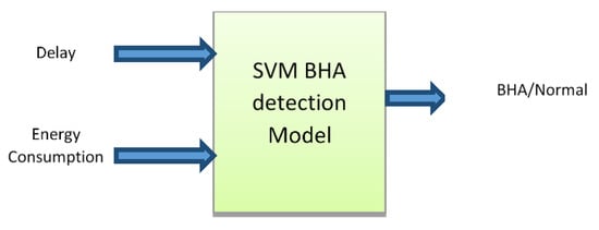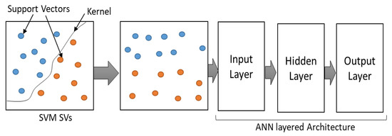 In this research, the dual mechanism of an ML approach including ANN and SVM is used. This helps to provide double security to the network. SVM is used as a binary classifier that helps to select only supportable features of sensor nodes and these features help to train the network with more efficiency and more accurate data. Therefore, during the transmission of data packets, ANN can select better nodes in the network and the network efficiency will be better compared to the single AODV approach. Here, the supportable sensor nodes feature acts as an input of the ANN in terms of node properties like coordinates, required time, and energy to transmit or receive the data packets. Based on these properties, ANN can decide to segregate the nodes into two categories, such as communicating and non-communicating nodes within the route.