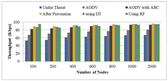 Throughput represents the transmission information of packets in a network. The analyzed values for four different scenarios with different numbers of nodes 100, 200, 400, 600, 800, 1000, and 2000 are listed in Table 5. Figure 14 depicts a graphical depiction of throughput.