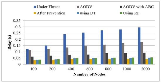 Figure 15 depicts the delay values studied for various methodologies. The blue color, red color, green color, violet color, sky blue color, and the orange color reflects the values of delay under threat, AODV, AODV with ABC, after prevention from BHA, using DT, and using RF, respectively. The average delay utilizing AODV under danger, AODV without threat, AODV with ABC, after prevention, using DT, and RF was 0.2304 s, 0.145 s, 0.079 s, and 0.04 s, 0.046 s, and 0.048 s, respectively.