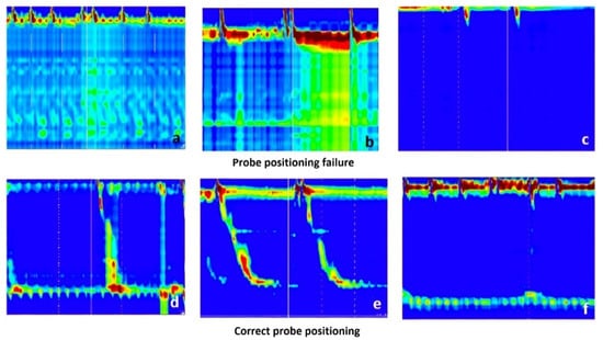Failure in probe positioning vs. correct probe positioning; (a) Lower esophageal sphincter (LES) is not clearly visible. There are several zones of high pressure, in the lower part of the esophagus, but with “mirror” effect suggesting a folded catheter; (b) LES is visible, however, during a swallow with pressurization, there is also an important pressurization at the gastric level, which is a “mirror” effect, suggesting that the probe coiled in the esophagus; (c) LES is not visible at all. In the lower images (d–f), the LES is clearly visible (as a green-yellow line in the lower part of the image, determined by the pressure of the LES), and below LES there is a blue band, suggesting that some sensors are in the stomach (the gastric pressure is the reference for manometric measurements).