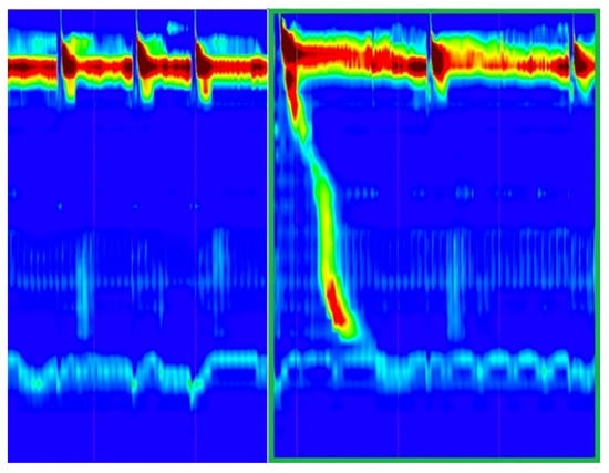 (a) Swallow with failed peristalsis and correct relaxation of lower esophageal sphincter (LES) (the color change was determined by a pressure drop, and the measured IRP was normal—the region of interest is marked by the yellow rectangle); (b) Swallow with failed peristalsis and absence of LES relaxation (the color remained constant, and the measured IRP was higher than the cut-off—the region of interest is marked by the red rectangle).