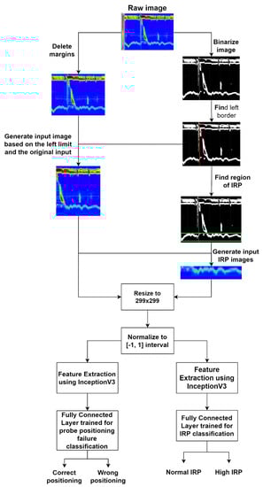 After pre-processing the raw image, we resized it to a dimension of 299 × 299, because the InceptionV3 model accepts an input image of this size. In the next step, we normalized all the pixel values to a range of [−1, 1], and the resulted matrix was fed to the feature extraction part. For the feature extraction step, we used the InceptionV3 CNN model, without the final classification layer, and pre-trained on the ImageNet dataset, in this way leveraging the power of transfer learning and overcoming the small data problem. We built two separate models, one for IRP classification and one for probe positioning failure detection. Both models used InceptionV3 as a feature extractor. In the final part of the models, we added a custom classification layer in which a global average layer [] with a dropout of 20% was used, thus avoiding overfitting problems, and a final fully connected layer containing two neurons in both cases, because for both models there are two available outputs/classes. The model was trained using the Adam optimizer [], with a batch size of 32 images and the data was shuffled in every epoch.
