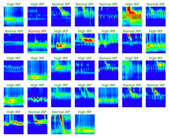 The second dataset contained labeled images regarding the IRP. It consisted of 1079 images from which 140 were images representing normal IRP and 939 were images representing IRP higher than the cut-off. The mean age of patients included in this dataset was 50.3 ± 17.5 years old, and 52.3% were males. Images for normal IRP were obtained from 14 patients: 6 with normal esophageal HRM, 3 with ineffective esophageal motility, 3 with absent contractility, 1 patient with fragmented peristalsis, and 1 with distal esophageal spasm. Images for higher than cut-off IRP were from 4 patients with esophago-gastric outflow obstruction and 90 patients with achalasia. All images were wet swallows without any added markings, except for the vertical white line (placed during the recording) for the test swallow. The images were saved using the software feature, which creates images representing 60 s of the recording, visible at the time on the screen. For analysis purposes, when images were saved, we made sure that the marking for the wet swallow was close to the middle of the image. Figure 1 and Figure 3 show examples for both normal and high IRP. Normally, after swallowing, the LES pressure drops for few seconds. The parameter that evaluates the swallow induced LES relaxation is the IRP, measured in the 10 s after swallowing (Figure 1 and Figure 3 in the yellow rectangle). In the case of a high IRP, there is little or no change in LES pressure after swallowing (Figure 1 and Figure 3 in the red rectangle).