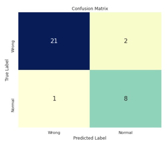 After passing the images through the pipeline presented in the previous section and after training our CNN model, the confusion matrix presented in Figure 10 was obtained. Only three out of 32 images were incorrectly classified by the model and the metrics are presented in Table 2.