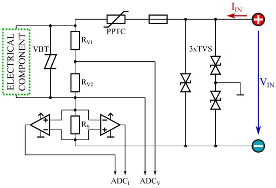 Figure 1 shows the circuitry of the measurement unit together with additional components for damage protection. This damage protection was added to ensure reliable operation in every possible use case and to make the sensor boxes robust against improper use and unwanted negative effects. Three transient voltage suppressor diodes (TVS diodes) are included to protect the internal circuitry from external electrostatic discharge (ESD). To protect the circuitry against applied voltages and currents beyond the specified ranges, a voltage-triggered bidirectional thyristor (VBT) and a polymeric positive temperature coefficient (PPTC) have been included.