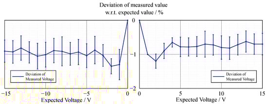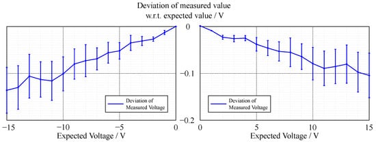 For voltage measurement, a voltage divider formed by two precision resistors and is used to map the applied voltage range to the differential input range of the analog to digital converter (ADC) . The current measurement is realized by measuring the voltage across the shunt resistor . This voltage is amplified by two anti-parallel instrumentation amplifiers and routed to the differential inputs of . As instrumentation amplifiers, current shunt monitors have been used which are characterized by a large range of bidirectional common-mode voltage. A sample rate of 4 ms is scheduled for the ADCs; therefore, the analog signals are low pass filtered in the hardware before they reach the ADC inputs. The sample rate can then be reduced in software to provide smoother data output.