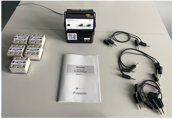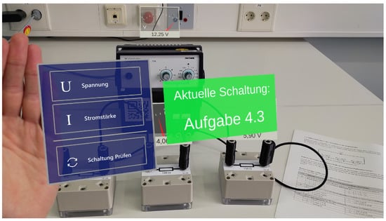 To counteract this problem, classical hands-on experiments have previously been enriched using virtual supporting information [,,]. One approach, for example, consists of supplementing traditional physics experiments with additional virtual representations [,]. Here, the use of augmented reality (AR) to present additional external representations increasingly comes into focus in educational research [,,,]. Using AR in laboratory settings thereby enables the integration of virtual information (e.g., measurement data) into the real environment without hindering interaction [,,]. This allows formerly invisible phenomena and abstract quantities to become visible (e.g., heat or electricity) as well as visualizing functional relations between real components and virtual visualizations using the spatial and temporal contiguity between them [,]. These possibilities have resulted in increasing use of AR in STEM education [,,,].