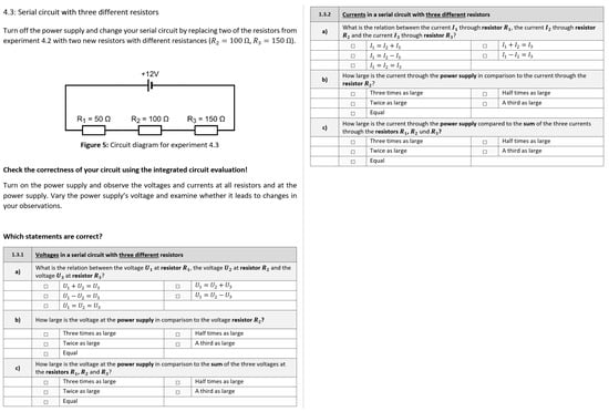 The base assumption of the CLT [,] is that of a limited working memory in which the learner must process all provided information in the form of elements and integrate them into their long-term memory, which is assumed to be unlimited. This cognitive load imposed on the learner can thereby be described in three categories: (a) intrinsic cognitive load (ICL) caused by the inherent complexity of the learning content, (b) extraneous cognitive load (ECL) caused by tasks that are not relevant to the learning process, and (c) germane cognitive load (GCL) describing the load created by the learning process itself. To measure these three categories of cognitive load in educational laboratory settings, for example, a questionnaire developed by Thees et al. [] can be used. Following the assumptions of the CLT, the ECL should be kept minimal to free capacity in the limited working memory for meaningful processing.