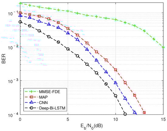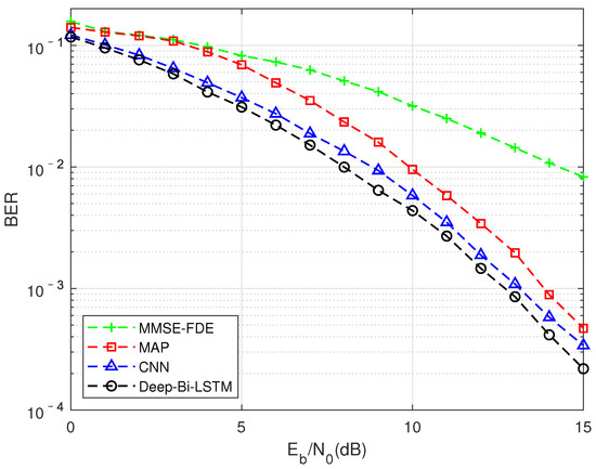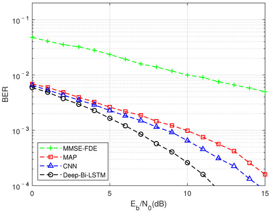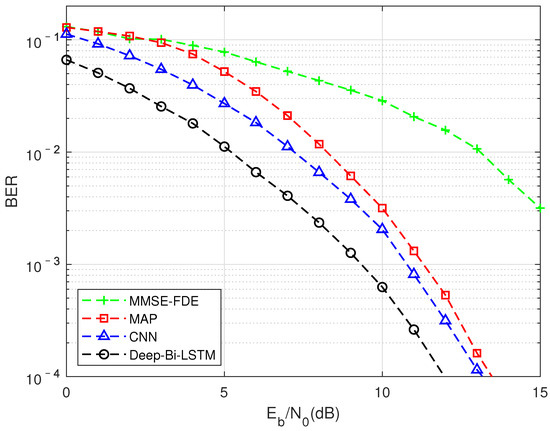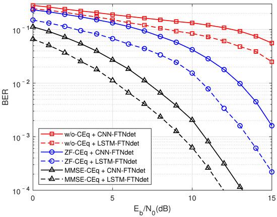 The black and blue curves in the figure represent the performance of using MMSE equalization and ZF equalization, respectively. It can be seen that the performance of using MMSE equalization is far superior to that of ZF equalization, even reaching 3–5 dB. The possible reason is that the ZF equalization does not consider the influence of noise factors, and the results of the MMSE equalization are quite different when the noise isarge, and the performance gap is reduced when the signal-to-noise ratio is relatively high. In addition, since ZF is an unbiased estimation, the noise signal will be amplified when the signal is equalized, thereby affecting the performance of the data driving method.