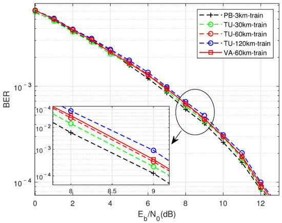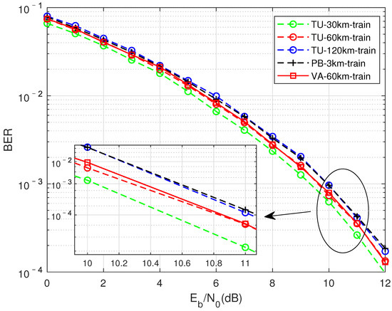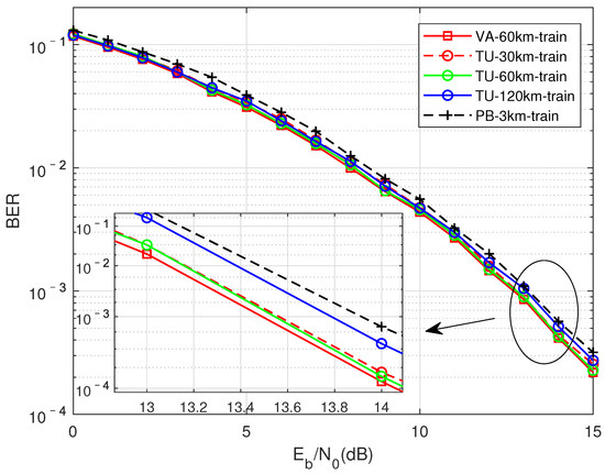 As shown in Figure 9, the comparison is when the FTN signaling compression factor = 0.7, the training data are generated from different channel states, and the test set uses the TU channel moving speed of 30 km for testing. In the figure, different colors represent different moving rates, and differentinearities represent different multipath channels. From an overall point of view, the BER performanceoss of networks trained on different channels for TU-30KM detection is about 0.3∼0.75 dB, showing good adaptability. It can be seen that the TU channel has the worst effect when the mobile speed is 120 km. This may be due to the existence of time selective fading caused by Doppler frequency shift, and theneads to the poor matching of data set, resulting in the decline of BER performance. The performance of the PB channel when the moving speed is 3 km is relatively poor in Figure 9 and Figure 10. The possible reason is that the moving speed of the PB channel is relativelyow, and the delay spread of the channel is relatively small, which willead to the relatively insufficient feature extraction of Doppler shift and frequency selectivity for its training network. The two red curves represent the BER performance of a TU channel with a moving speed of 60 km for training, and the performance of training with a VA channel of 60 km has a small difference in the case of a higher signal-to-noise ratio. Therefore, the difference in channel state is not the only reason thateads to the generalization ability of the model. Time-selective fading and frequency-selective fading can also be used as features that affect the BER.