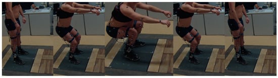 All the subjects were instructed to perform the squat task with feet placed shoulder width apart, arms stretched out in front of the body and parallel to the floor and according to the following instruction: “descend to a level to where your posterior thighs are parallel to the floor and then ascend” [46] (Figure 2). Every subject performed 3 double leg squats.