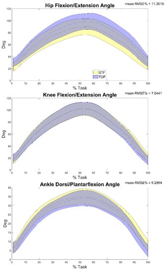 Hip, knee and ankle flexion/extension angles during the task calculated through stereophotogrammetry (STF—blue) and video-based tracker (TOF—yellow) and the mean RMSE% of the comparison between the two. Averages plus and minus one standard deviation are reported as colored bands.