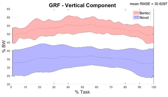 Vertical component of the GRF during the task recorded through the force plates (Bertec—red), and through the plantar pressure system (Novel—blue) and mean of RMSE% of the comparison between the two. Averages plus and minus one standard deviation are reported as colored bands.