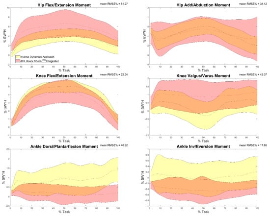 Hip, knee and ankle adduction/abduction and flexion/extension moments during the task calculated through inverse dynamics (yellow) and through ACL Quick Check® integrated (red) and mean of RMSE% of the comparison between the two. Averages plus and minus one standard deviation are reported as colored bands.